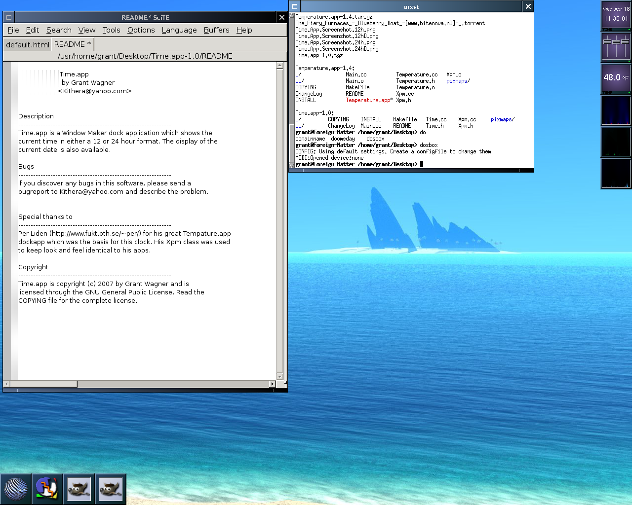 A screenshot of my system using Time.app, Mixer.app Temperature.app, and three instances of wmfire to monitor my system usage. |